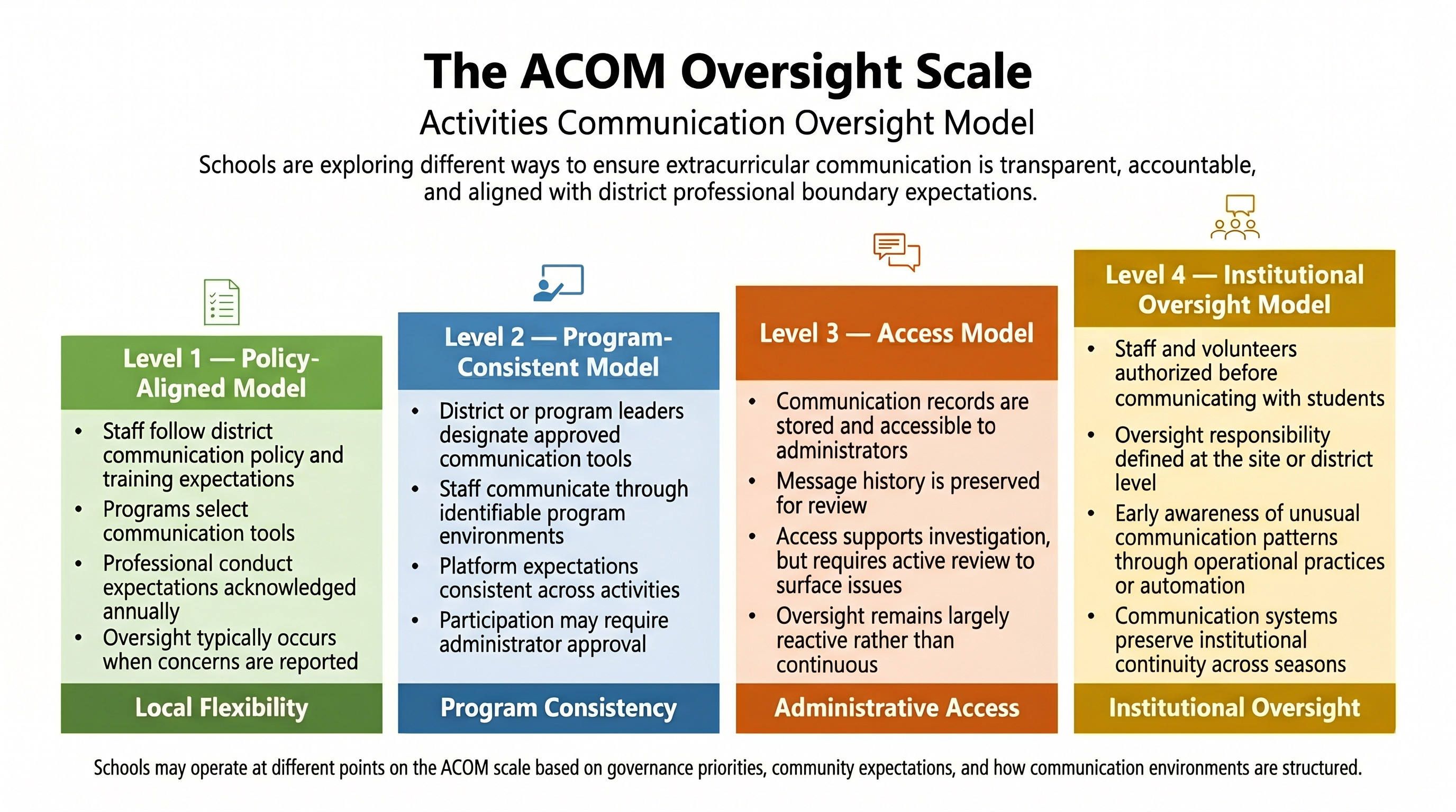 The ACOM scale describes four common governance approaches schools use when managing extracurricular communication.