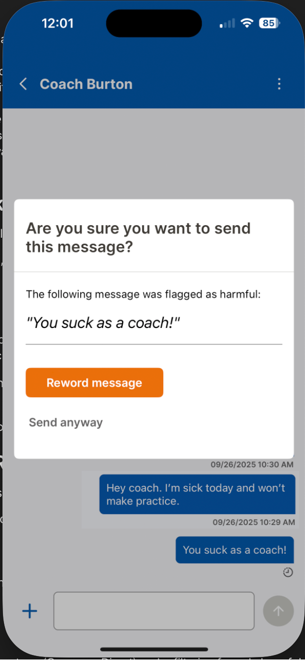 Guardian is designed to create a safer communication environment for your teams while ensuring compliance with school and district policies. It allows you to enable direct messaging (DMs) between coaches and athletes with confidence, knowing that all communications are traceable and monitored for harmful content.