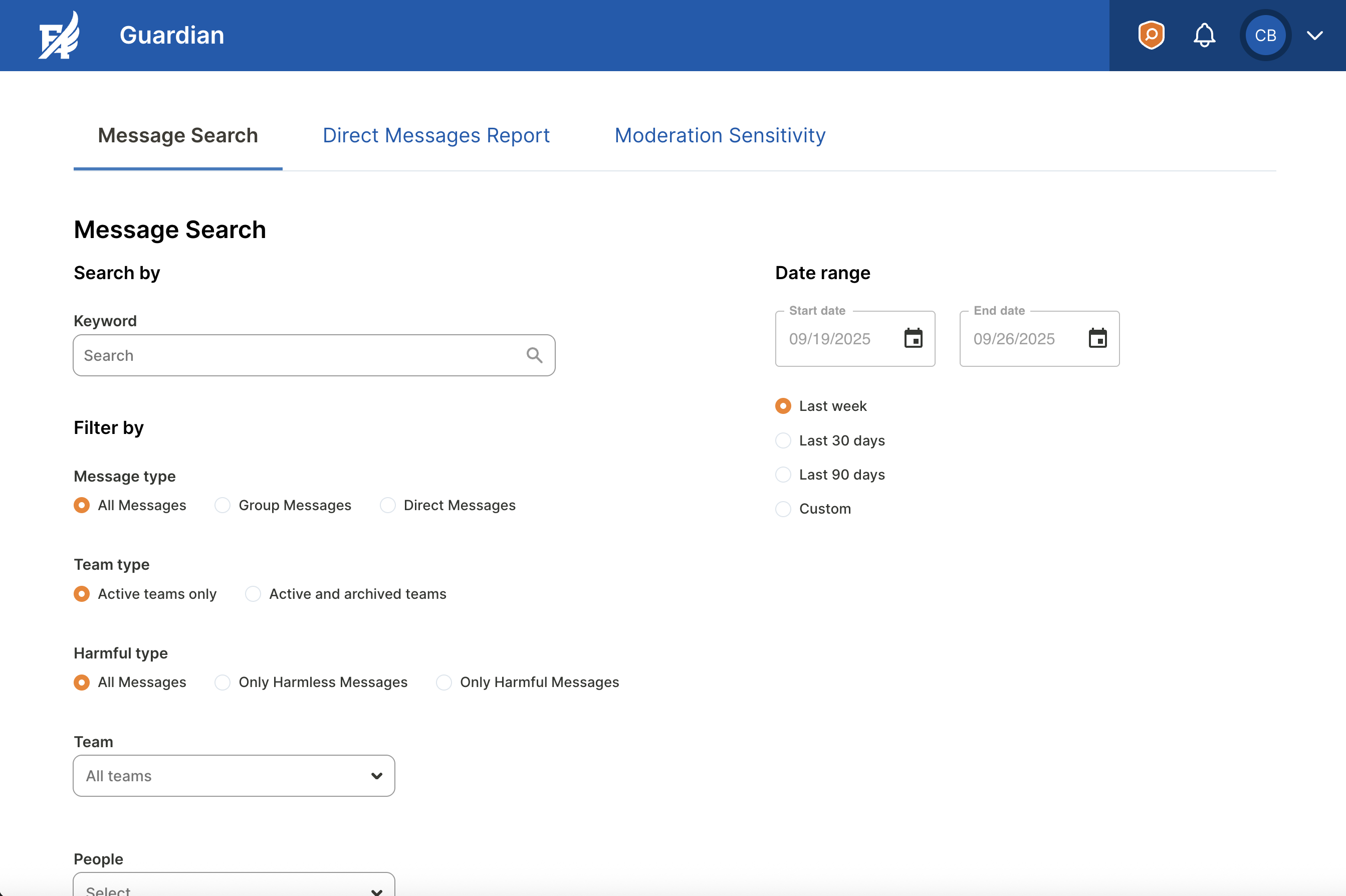 - Search and Filter: Find messages using keywords, date ranges, message type (Group vs. Direct), or by filtering for only harmful messages above a certain score.